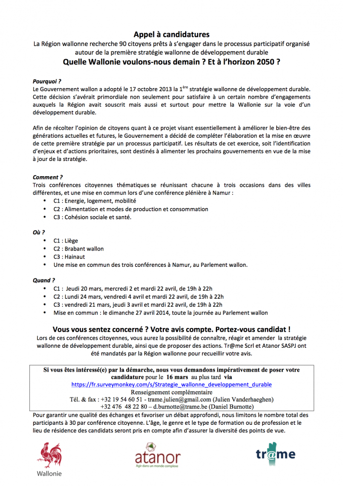 Il nous semble important de répercuter cette information dont l'objectif est d'élargir le débat sur la stratégie wallonne de développement durable et à inclure les points de vue de non-spécialistes afin d’éclairer la prise de décisions.