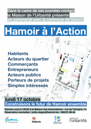 Dans le cadre de ses journées contact focalisées sur les pôles gares, la Maison de l'Urbanité, en collaboration avec la Commune de Hamoir, présente "Hamoir à l'Action". Habitants, acteurs du quartier, commerçants, entrepreneurs, acteurs publics, porteurs de projets, simple intéressés, rendez vous le lundi 17 octobre pour construire le futur de Hamoir ensemble.