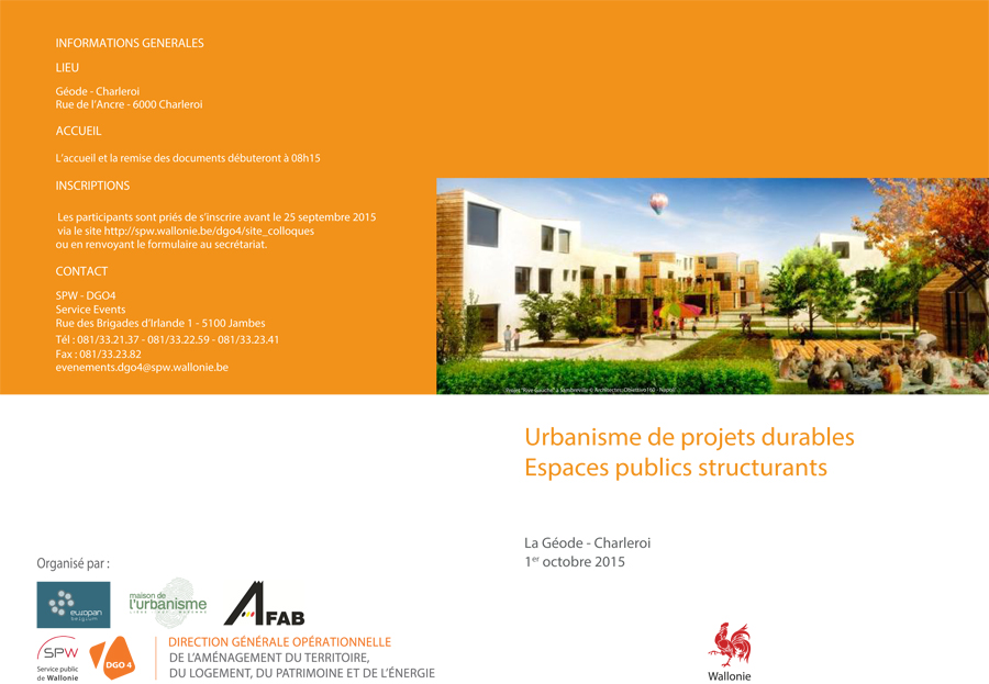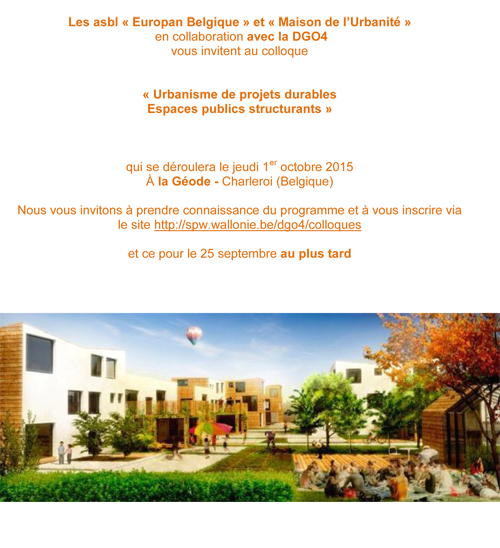 Les asbl "Europan Belgique" et "Maison de l’Urbanité" en collaboration avec la DGO4 vous invitent au colloque "Urbanisme de projets durables Espaces publics structurants" qui se déroulera le jeudi 1er octobre à la Géode de Charleroi.