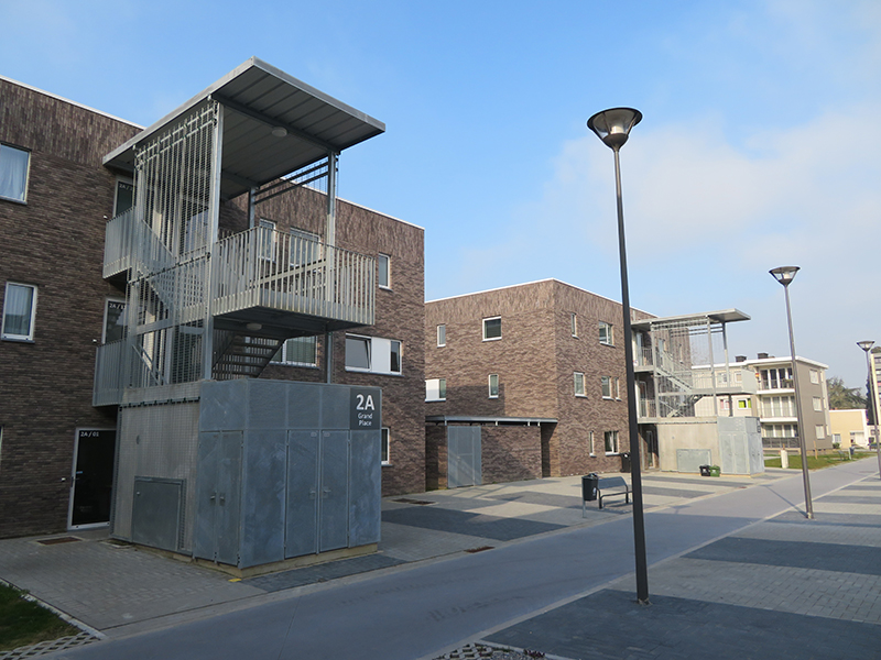 Les espaces de services extérieurs des logements (accès, locaux poubelles, motos/ vélos) assurent la continuité et l’animation des immeubles © JM.Degraeve.