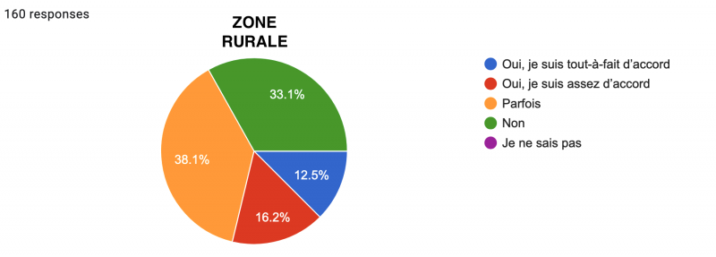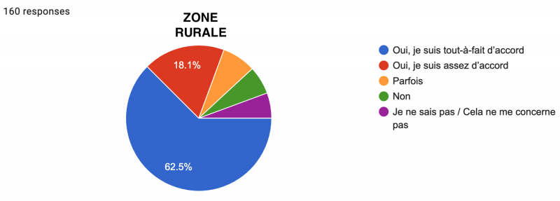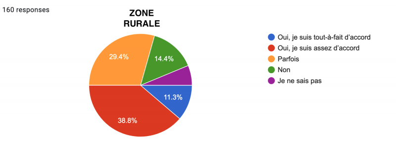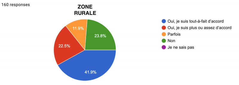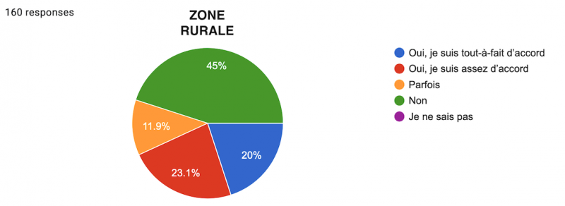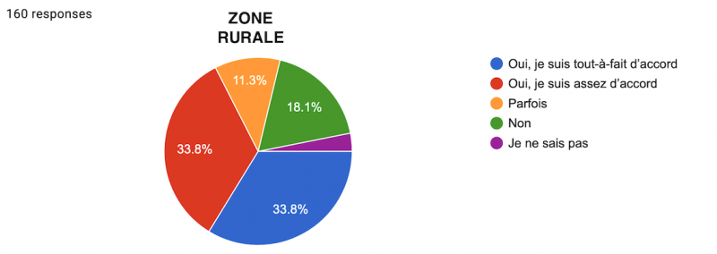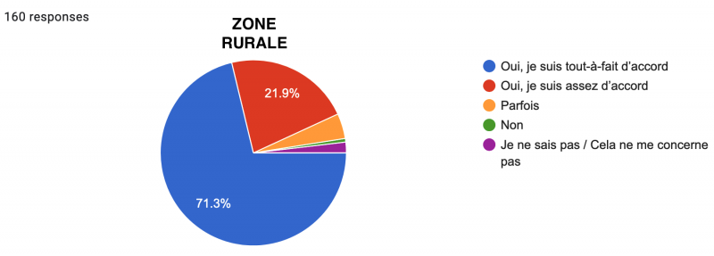Néanmoins, une lecture plus détaillée des résultats nous renseigne à nouveau sur une nette différence urbain/rural : alors qu’une écrasante majorité des urbains sont soit "Tout-à-fait d’accord" (57,7%), soit "Assez d’accord" (27,2%), ne laissant que peu de place aux "Parfois" (6,9%), "Non" (7,3%) et "Sans avis" (0,8%) ; les résultats des ruraux sont beaucoup plus partagés, même si la tendance générale reste la même : 33,8% sont tout-à-fait d’accord, 33,8% sont assez d’accord, 11,3% répondent "Parfois", 18,1% "Non" et 3,1% sont sans avis.