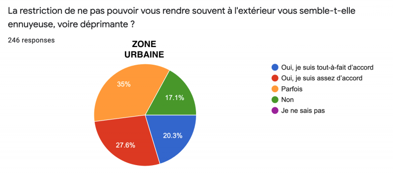 À la question "La restriction de ne pas pouvoir se rendre souvent à l’extérieur semble-t-elle ennuyeuse ou déprimante ?", la réponse la plus largement exprimée est "Parfois", à 36,2%. Il est également intéressant de noter que 33,1% des ruraux ont répondu par la négative pour seulement 17,1% des urbains !