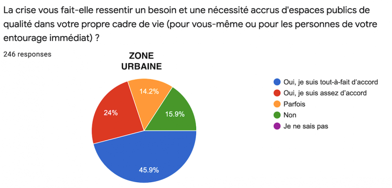 Cette différence de sensibilité se révèle d’autant plus criante à la question de savoir si "la crise fait ressentir un besoin accru d’espaces publics de qualité". Pour les urbains, 45,9% répondent "Oui, tout-à-fait" et la somme des trois réponses affirmatives totalisent chez ceux-ci 84,1%. Par contre, pour les ruraux, pas moins de 45% répondent par la négative !