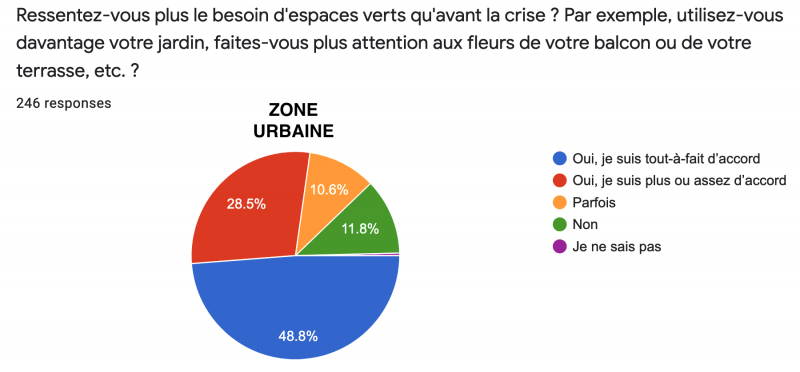 Sans surprise, à la question de savoir si "nous ressentons plus le besoin d’espaces verts (publics ou privés) qu’avant la crise", 46,1% des répondants ont répondu "Oui, tout-à-fait d’accord" (48,8% d’urbains et 41,9% de ruraux). Mais là aussi une différence notable se démarque pour le "Non" : 11,8% chez les urbains et 23,8% chez les ruraux.