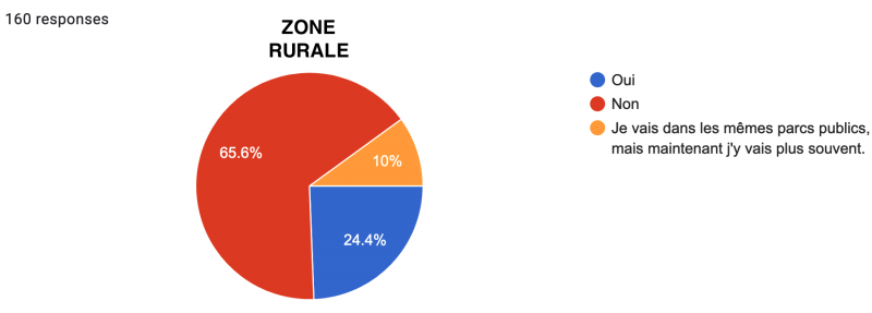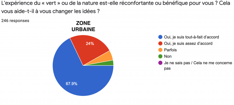 Les réponses urbaines et rurales sont par contre très similaires lorsqu’il s’agit d’estimer si "l’expérience de la nature (ou de la verdure) est bénéfique", 69,2% ont répondu "Oui, tout-à-fait", tandis que seuls 2% ont répondu négativement.
