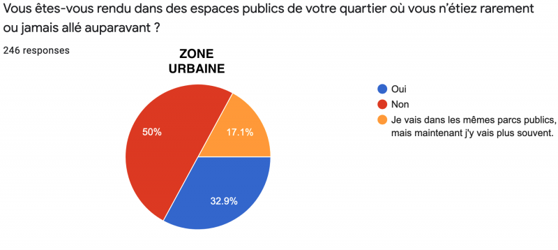 Au-delà de la réponse majoritaire, il n’est pas anodin de remarquer qu’un petit tiers des répondants ont "découvert" pendant ce confinement des espaces publics qu’ils ne fréquentaient pas (ou rarement) auparavant. Rapporté à l’échelle d’une population, cela peut potentiellement faire beaucoup.