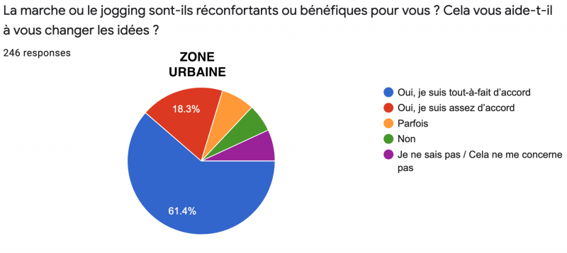Elles sont aussi fort similaires en ce qui concerne la question : "La marche ou le jogging vous sont-ils bénéfiques ?" où 61,8% sont "Tout-à-fait d’accord" (à noter les 6,2% de réponses négatives et les 6,4% qui ne savent pas ou ne se sentent pas concernés).
