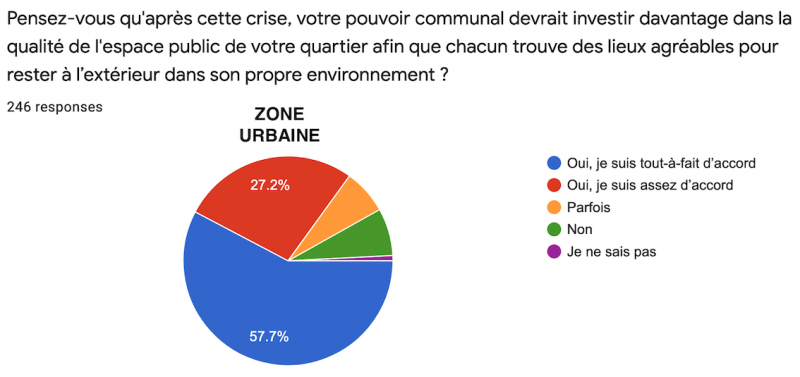 L’avant-dernière question se présentait ainsi : "Pensez-vous qu’après la crise, votre pouvoir communal devrait investir davantage dans la qualité de l’espace public de votre quartier afin que chacun trouve des lieux agréables pour rester à l’extérieur dans son propre environnement ?". Sans surprise, la réponse la plus communément cochée était "Oui, tout-à-fait d’accord" à 48,3%.