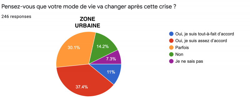 La dernière question portait sur nos comportements d’après-crise : "Pensez-vous que votre mode de vie va changer après cette crise ?". La réponse la plus souvent choisie fut "Oui, assez d’accord" (37,9%), suivi de "Parfois" (29,8%). Les moins convaincus ("Non") rassemblaient 14,3% des réponses tandis que les plus motivés ("Oui, tout-à-fait d’accord") totalisaient 11,1%. Enfin, le choix de l’indécision ("Je ne sais pas") fut coché par 6,9% des répondants. Ici, aucune différence notable entre les milieux de vie.