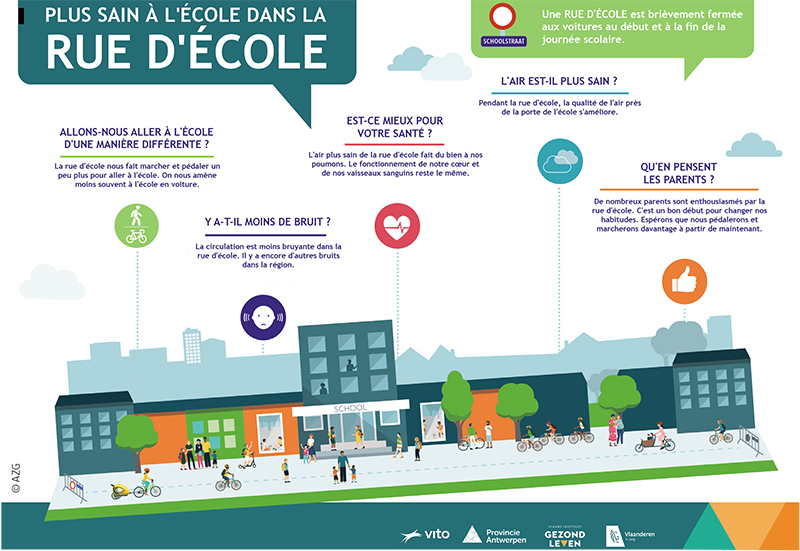 Une rue d'école est une rue qui est fermée aux transports motorisés pendant une courte période au début et à la fin de la journée scolaire. L'objectif de cette mesure consiste à briser le cercle vicieux qui fait que de plus en plus de parents amènent leurs enfants à l'école en voiture, car l'environnement scolaire devient de plus en plus dangereux. L'organisation partenaire Milieugezondheidszorg a étudié l'effet d'une rue d'école sur la santé et le bien-être, le bruit et la qualité de l'air ainsi que la mobilité.