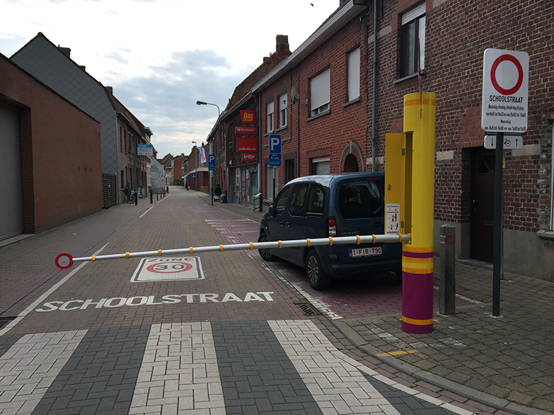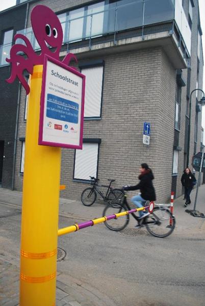Les poteaux à la petite pieuvre (Octopus), qui sont bien connus maintenant, sont aussi proposés avec une barrière rabattable pour les rues d’écoles. © Voetgangersbeweging