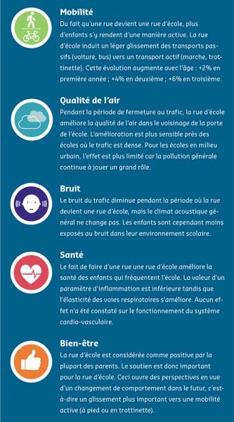Une rue d'école entraîne donc des gains pour la santé à plusieurs niveaux. Il s'agit donc d'un moyen intéressant pour les autorités locales de créer un espace public sain. Pour chaque environnement scolaire, il est préférable de rechercher la meilleure façon de rendre l'environnement scolaire non seulement plus sûr, mais aussi plus sain et plus agréable. Pour accroître le soutien à la mesure, une coopération entre les représentants de tous les acteurs (école, parents, voisins, commerçants et entreprises locales, différentes compétences politiques) est très importante.