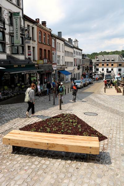 La surface d’intervention du projet concerne environ 7 000 m2 comprenant la rénovation de la rue principale, épine dorsale du projet. Cette ancienne nationale a ainsi été déclassée pour devenir une voirie locale partagée et en sens unique où piétons, cyclistes et conducteurs font bon ménage. En déviant le trafic de transit, qui était intense, bruyant et polluant, nous avons changé le statut de la route et ainsi permis l’aménagement d’espaces publics de qualité et agréable pour les visiteurs comme pour les habitants. La mobilité douce a guidé l’aménagement de la voirie qui laisse un large espace dédié aux vélos, trottoirs et terrasses. Il se présente comme un parcours sinueux pour décourager la vitesse, limitée désormais à 30km/h.