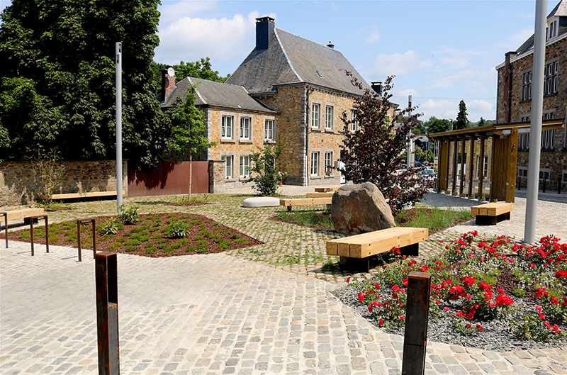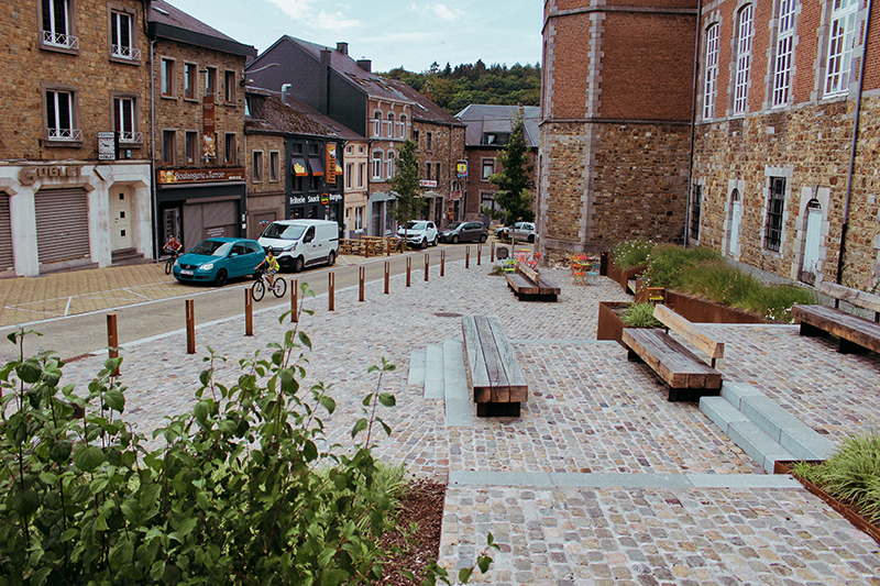 Concernant les matériaux de voirie, on a opté pour une alternance entre le béton imprimé permettant une bonne résistance aux contraintes existantes (passage de bus et forte pente), les briques de terres cuites pour les trottoirs et les pavés de pierre naturelle au niveau des différentes places historiques. L’utilisation de la pierre bleue locale est également récurrente pour les terrasses et les petits ouvrages d’art (escalier, murets, plinthes...).